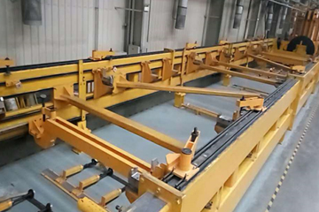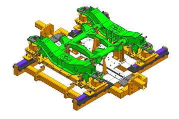 該工裝用于350公里動(dòng)車組車體底架的翻轉(zhuǎn),將底架鋼結(jié)構(gòu)翻轉(zhuǎn)一定角度,使得焊縫處于平焊位置,而且配合設(shè)計(jì)可以電動(dòng)升降的小車,從而方便焊接操作,保證焊接質(zhì)量。